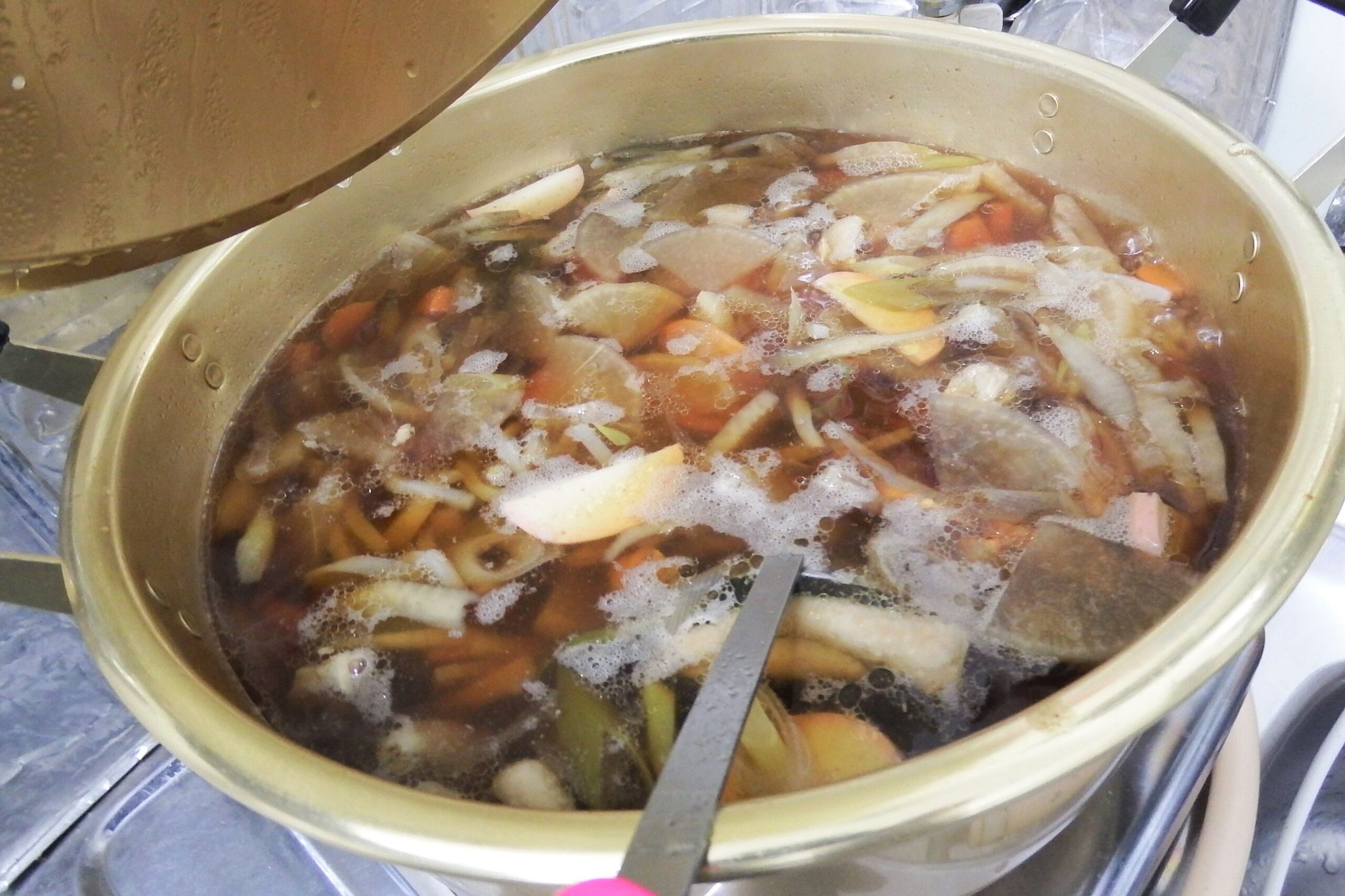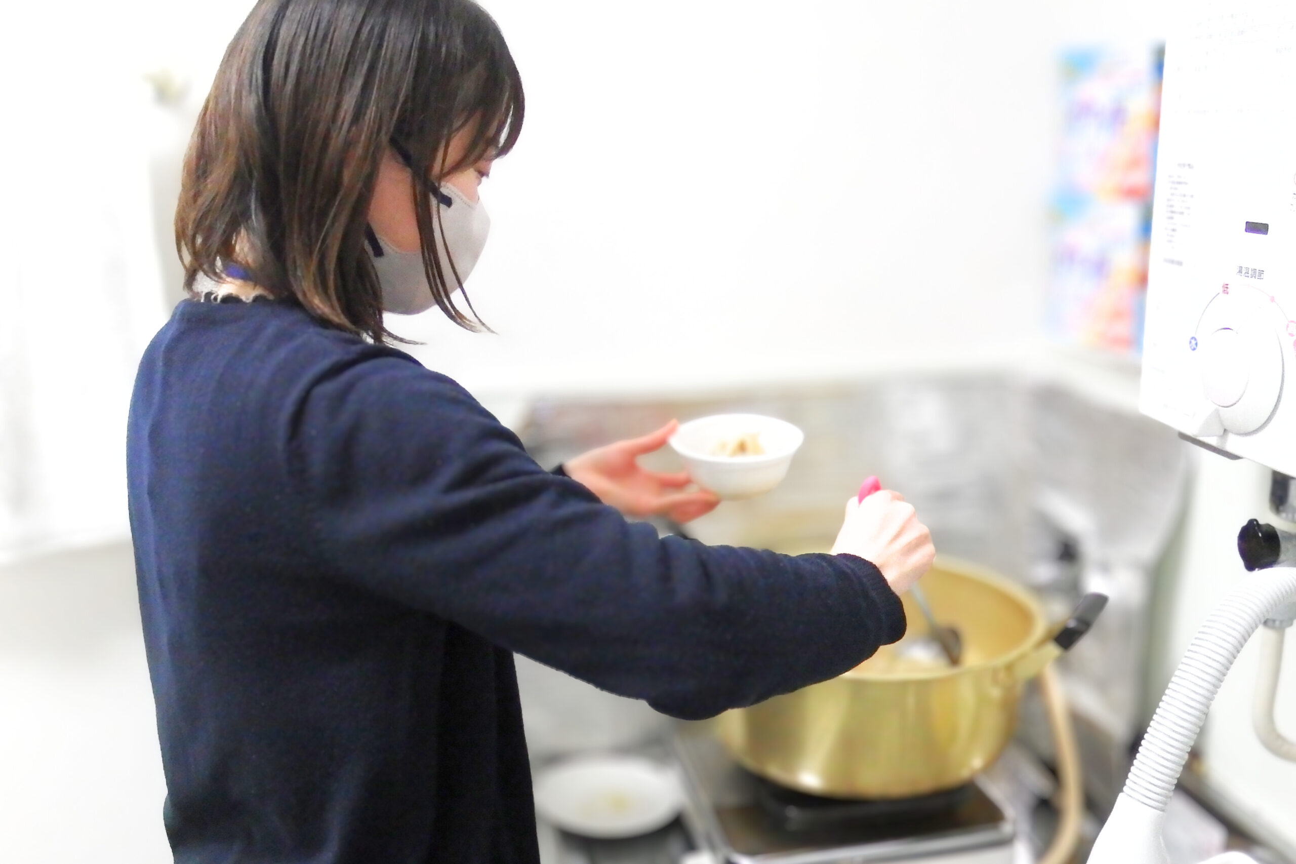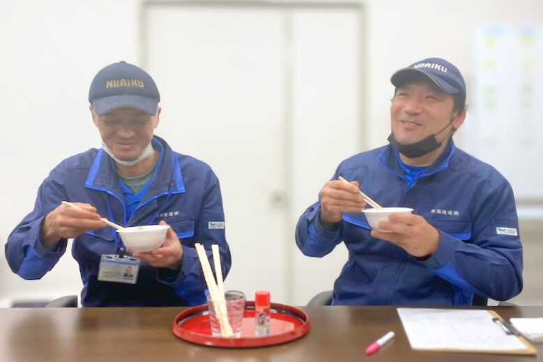 寒い中頑張ってくれている乗務員の皆さんへ、事務員が愛情を込めて手作りのお雑煮を振る舞います。