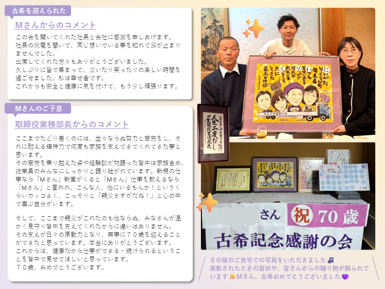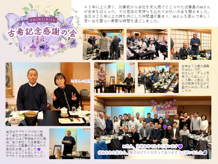 創業前から会社を支えてこられた従業員のMさんが古希を迎えられ、